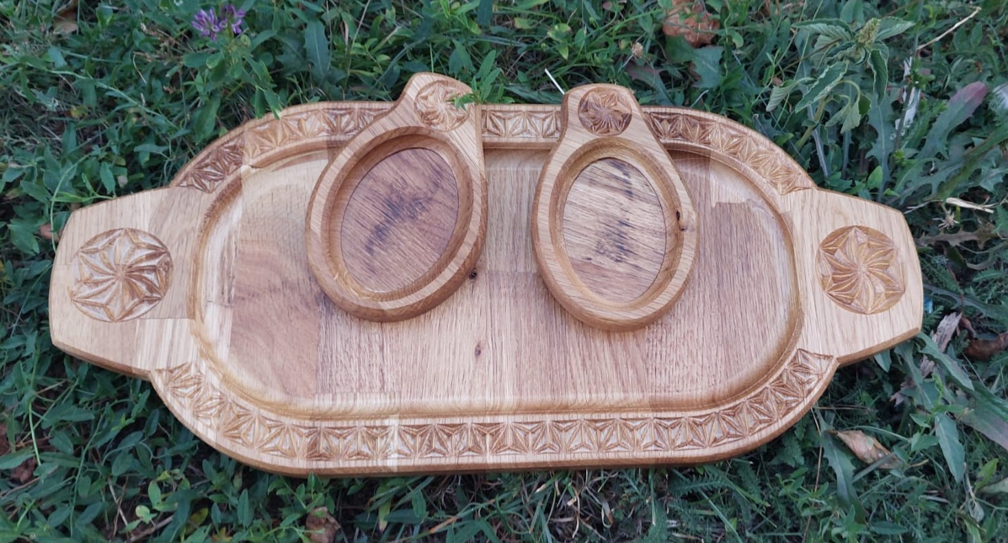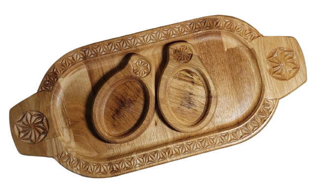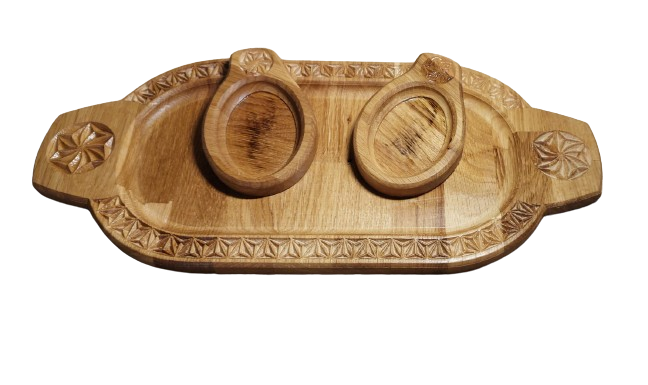 Setul include un platou mare din lemn cu 2 sosiere cu motive tradiționale.